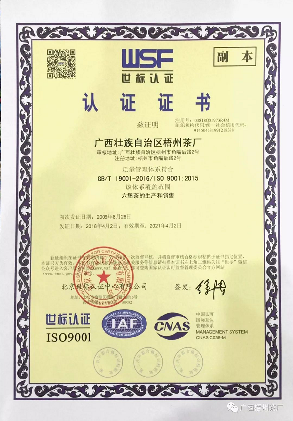 快訊 | 梧州茶廠獲得新版質(zhì)量管理體系認證證書
